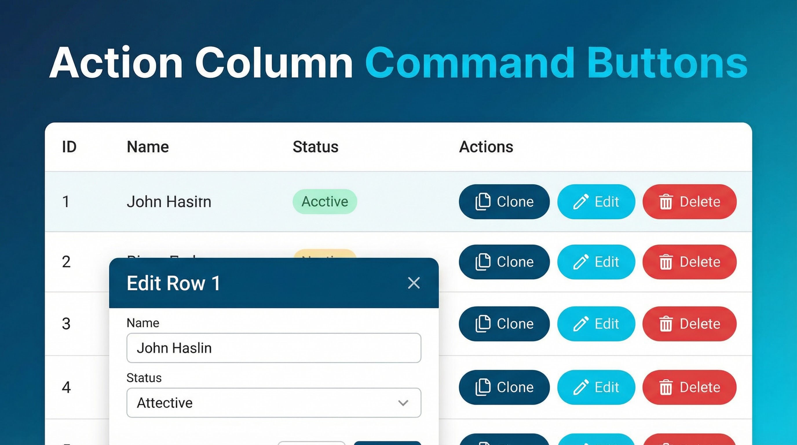 Command buttons in Action Columns make it easy for run-time users to add, edit and delete rows