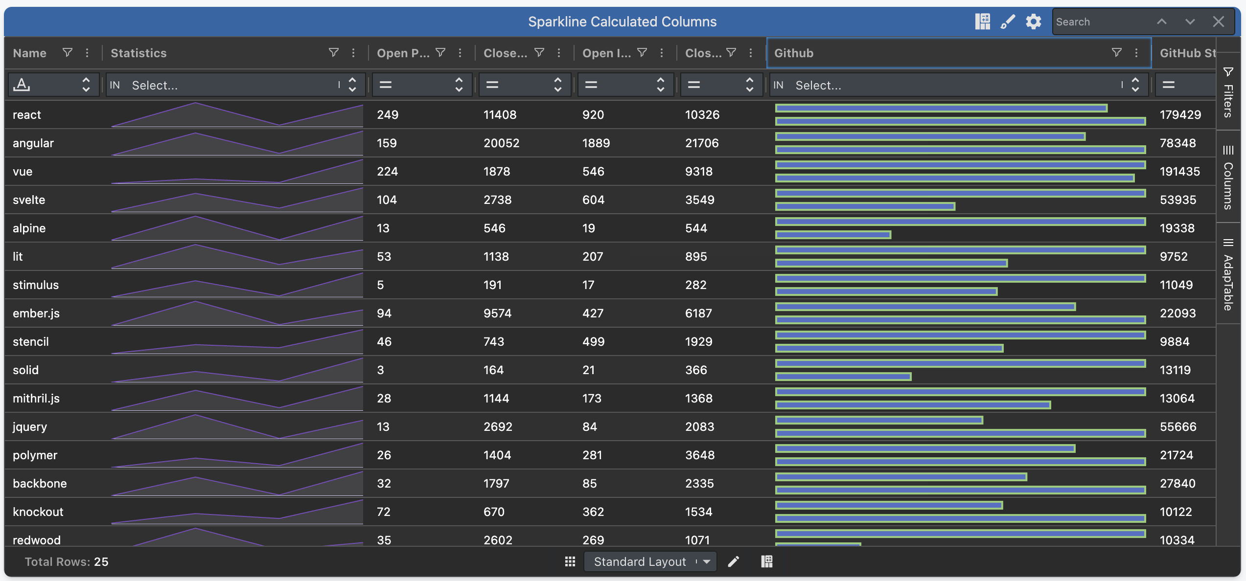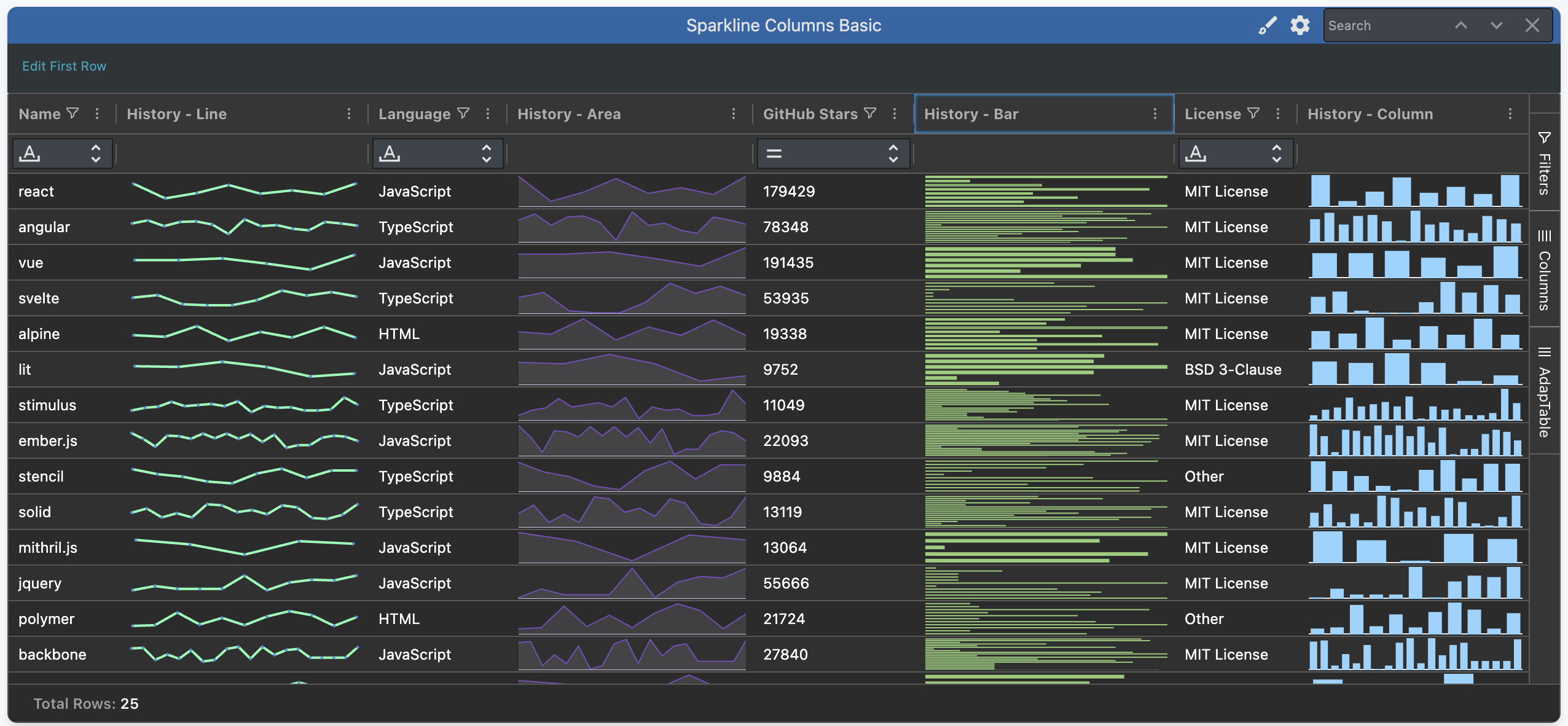 New Array Column to display multiply cell values, which can be rendered as Sparklines or with multiple Badges, and supports per-value filtering