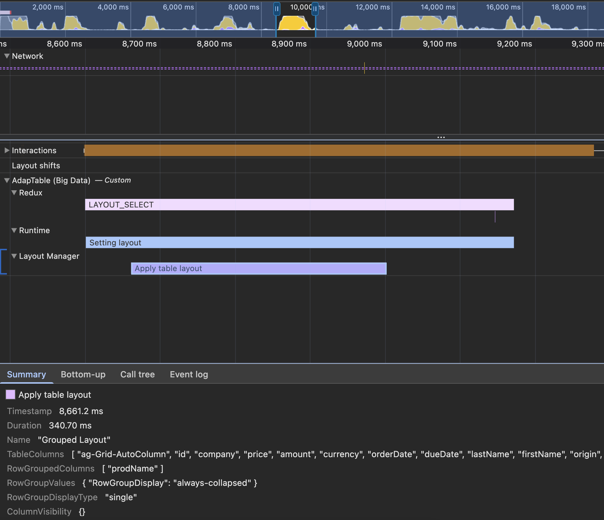 localStorage.debug = '*'In this picture, you can see a recorded profile and how AdapTable displays its custom tracks.