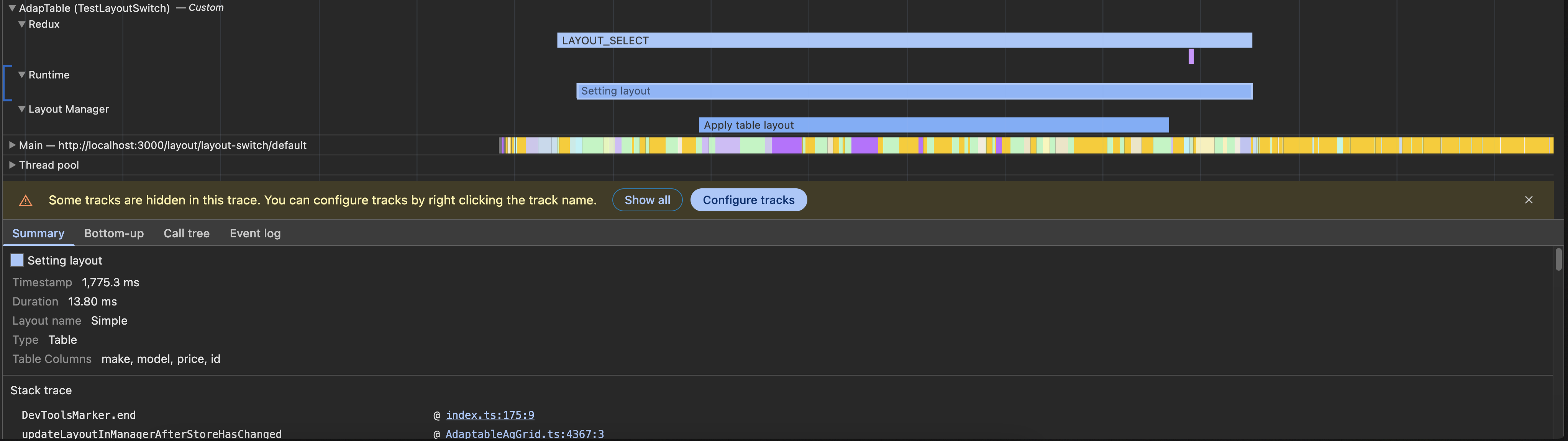 In order to see the custom dev tracks for AdapTable, you have to enable them by setting the adaptableProfileTracks key to "true" in your localStorage: